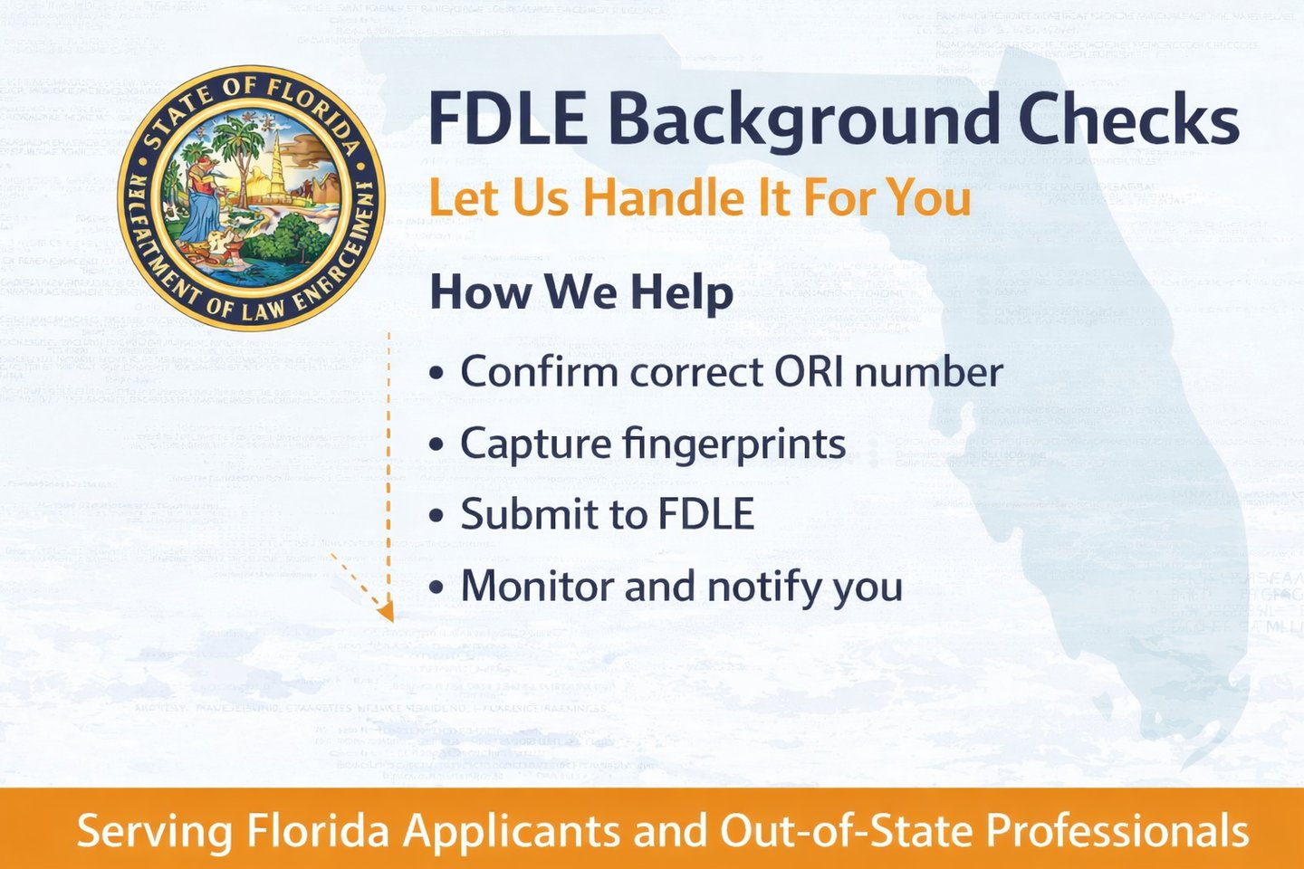 Learn what an FDLE background check is, when it’s required, and how Four Points Fingerprinting can manage the entire process for you (from fingerprinting and submission to tracking and completion) so everything is handled accurately and without delays.