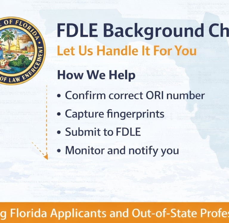We regularly assist Florida residents, out-of-state applicants applying to Florida agencies, and professionals working on tight timelines who need the process handled correctly and efficiently. If you’re unsure whether you need an FDLE background check or want help managing the process from start to finish, we’re happy to guide you and take it off your plate.